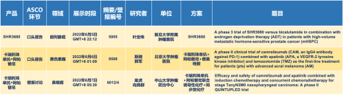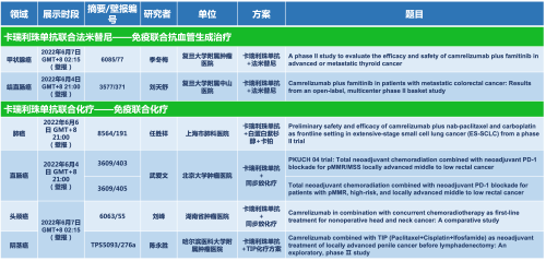 卡瑞利珠单抗联合AG亚游医药的另一款创新药法米替尼在甲状腺癌和结直肠癌领域有2项研究被接收为壁报,另有卡瑞利珠单抗联合化疗的4项研究在肺癌、结直肠癌、头颈癌和阴茎癌领域的研究被接收为5份壁报。