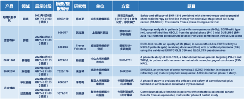 2022 ASCO年会另有5款AG亚游医药上市前抗肿瘤创新药的相关研究被接收为壁报,包括SHR-1316、普那布林、法米替尼、SHR-1701和SHR2554,他们的单药或联合方案相关7项研究被接收为壁报,覆盖肺癌、鼻咽癌、淋巴瘤、甲状腺癌和结直肠癌等领域。