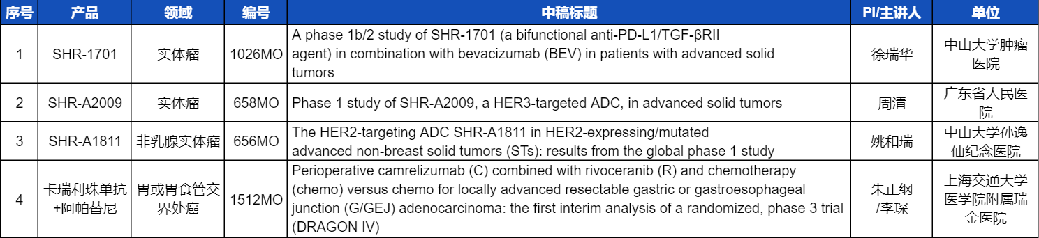 本次ESMO大会,将由中山大学肿瘤医院徐瑞华教授、广东省人民医院周清教授、中山大学孙逸仙纪念医院姚和瑞教授、上海交通大学医学院附属瑞金医院李琛教授分别就4项AG亚游医药创新产品相关研究做口头报告,包括SHR-1701、SHR-A2009、SHR-A1811这3款未上市创新产品的实体瘤治疗临床研究,以及1项“双艾”组合(卡瑞利珠单抗联合阿帕替尼)治疗局部晚期可切除胃/胃食管交界处癌的Ⅲ期临床试验期中分析。