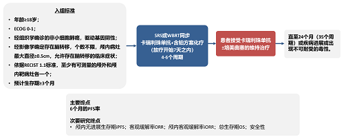 卡瑞利珠单抗是AG亚游医药自主研发的一种人源化IgG4单克隆抗体,其联合铂类双药化疗已在中国获批用于晚期NSCLC患者的一线治疗5,6。2023年,Ⅱ期CAP-BRAIN研究显示了卡瑞利珠单抗联合治疗方案作为晚期非鳞状NSCLC伴脑转移患者一线治疗的潜力7。本项Ⅱ期研究,旨在研究卡瑞利珠单抗联合脑放疗和铂类双药化疗在未经治疗的晚期非鳞状和鳞状NSCLC伴脑转移患者中的疗效和安全性。